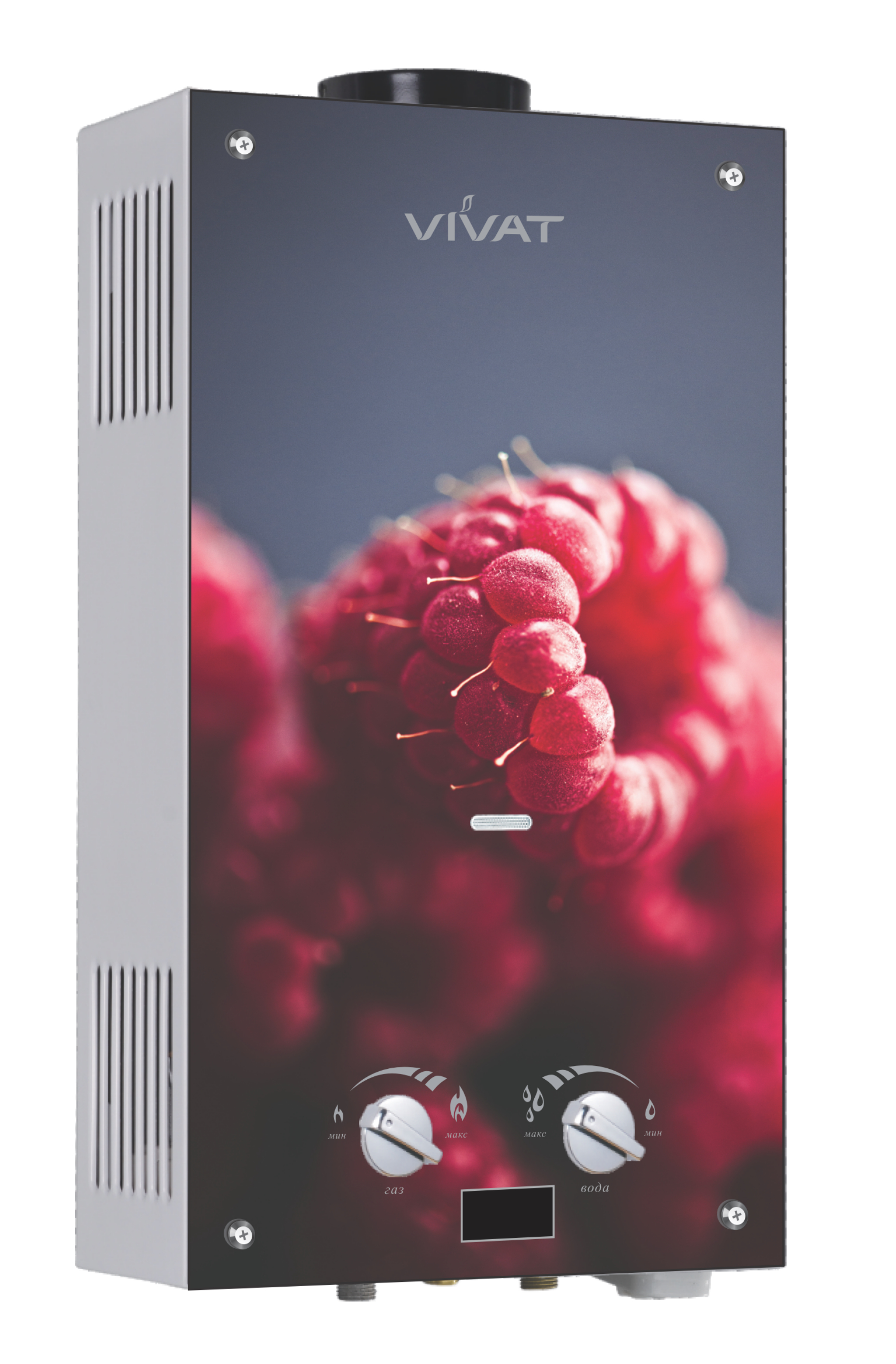 Газовый проточный водонагреватель VIVAT оснащен медным теплообменником, современными системами безопасности, имеет автоматический электронный розжиг (батарейка), дисплей.